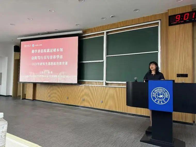 崔妍老师以“勤学善思练就过硬本领,奋楫笃行书写青春华章”为主题开启本堂思政教育课。她一开场就通过别开生面的方式——以一名吉大学姐的身份与同学们交流,迅速拉近了自己与新同学们之间的距离。随后,崔妍老师从个人、学校和社会三个维度出发,通过讲述自己的亲身经历与同学们深入探讨了研究生需要承担的责任和应具备的素质。