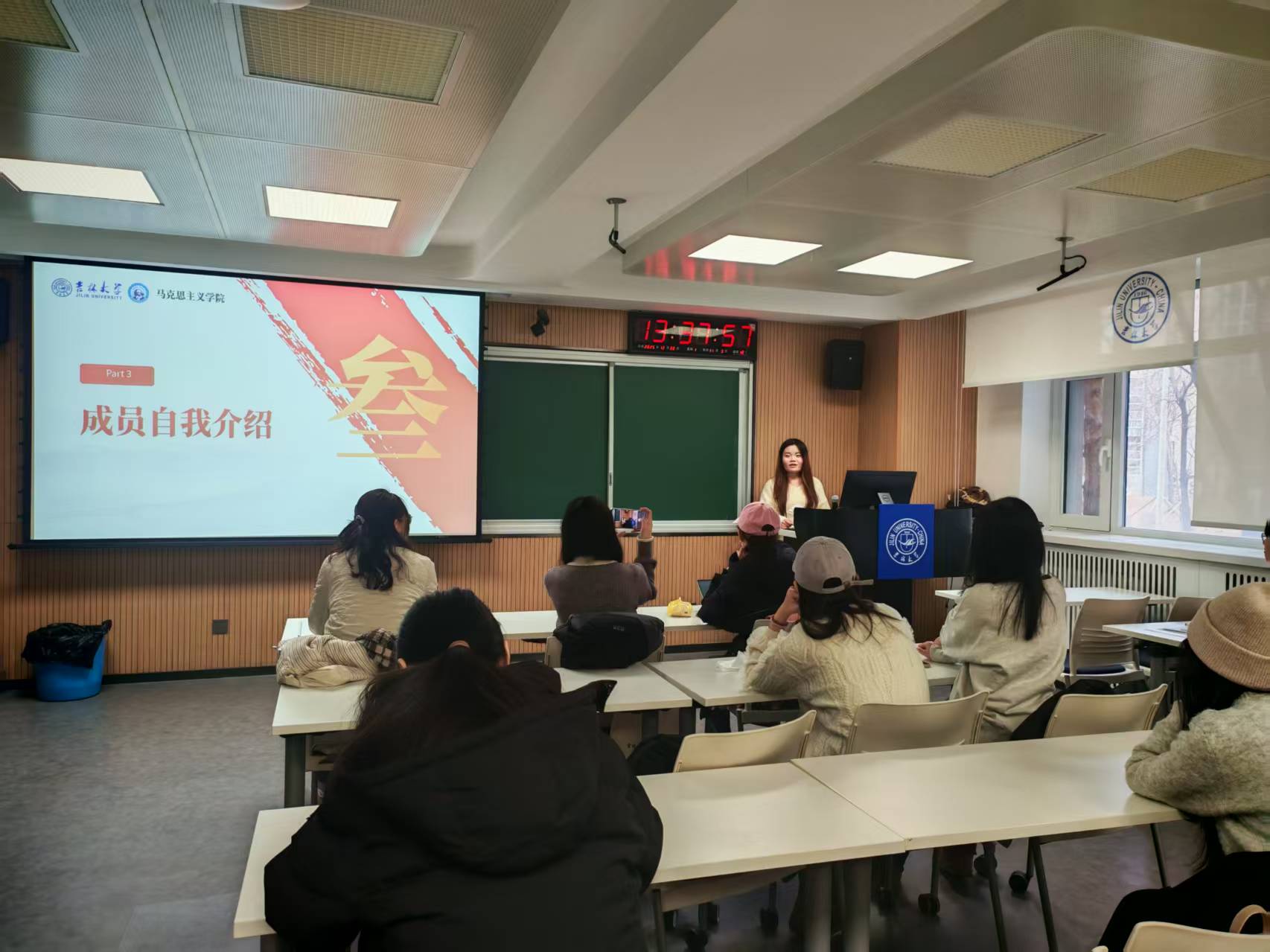 刘盈利同学对M·M学习研究会做基本介绍。围绕“什么是M·M理论学习研究”“为什么要进行M·M理论学习”“如何将M·M理论转化为实践”三大核心问题展开系统介绍。开展M·M理论学习,既是把握时代发展规律、增强“四个自信”的理论需求,也是马院学子筑牢信仰根基、践行青年使命的必然选择。在实践层面,负责人也为成员们明确方向:要依托马院学科优势与师资力量,夯实学术根基,提升研究专业性和前瞻性。