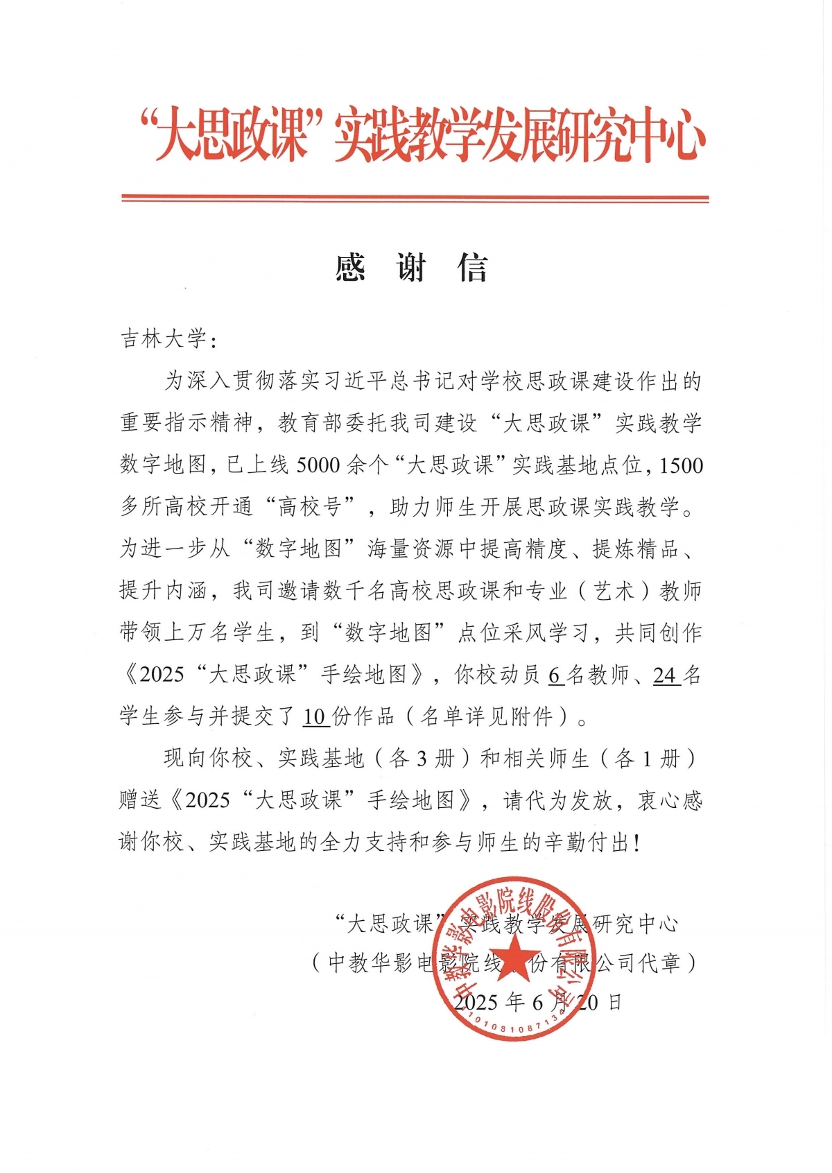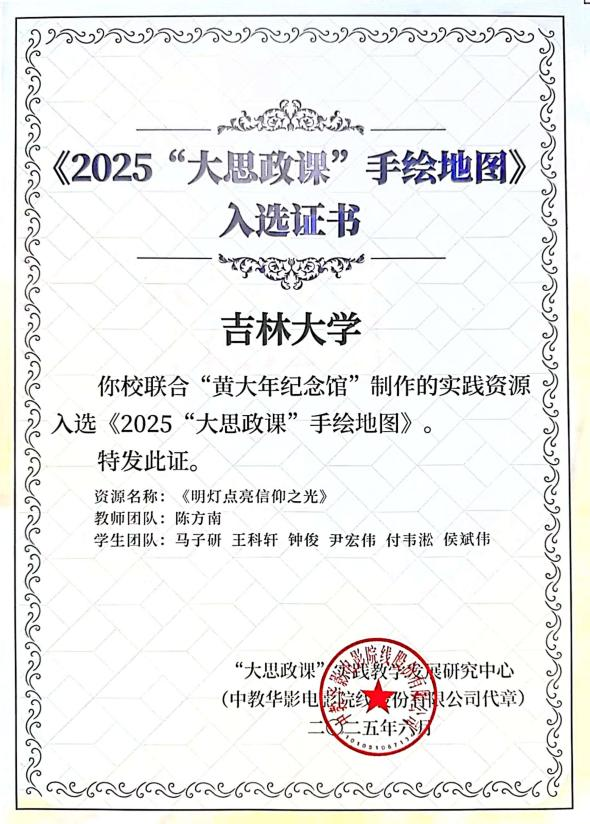 黄大年纪念馆,传承“人民教育家”宝贵的实践教育资源,打造出以黄大年先生为故事原型的优秀作品——《明灯点亮信仰之光》,并成功入选教育部《2025“大思政课”手绘地图》。日前,“大思政课”实践教学发展研究中心向我院发来感谢信,感谢我院师生以及杏吧视频