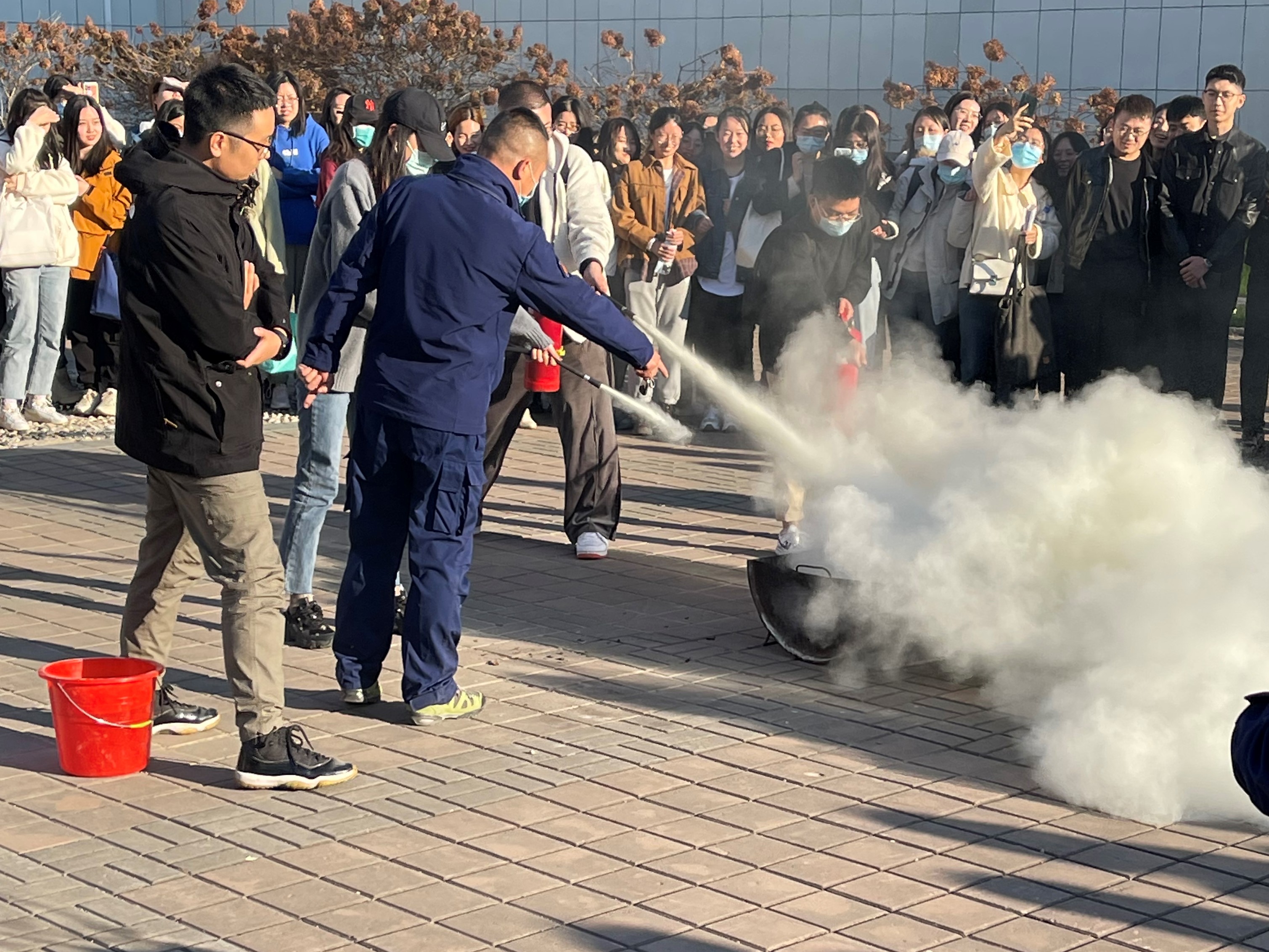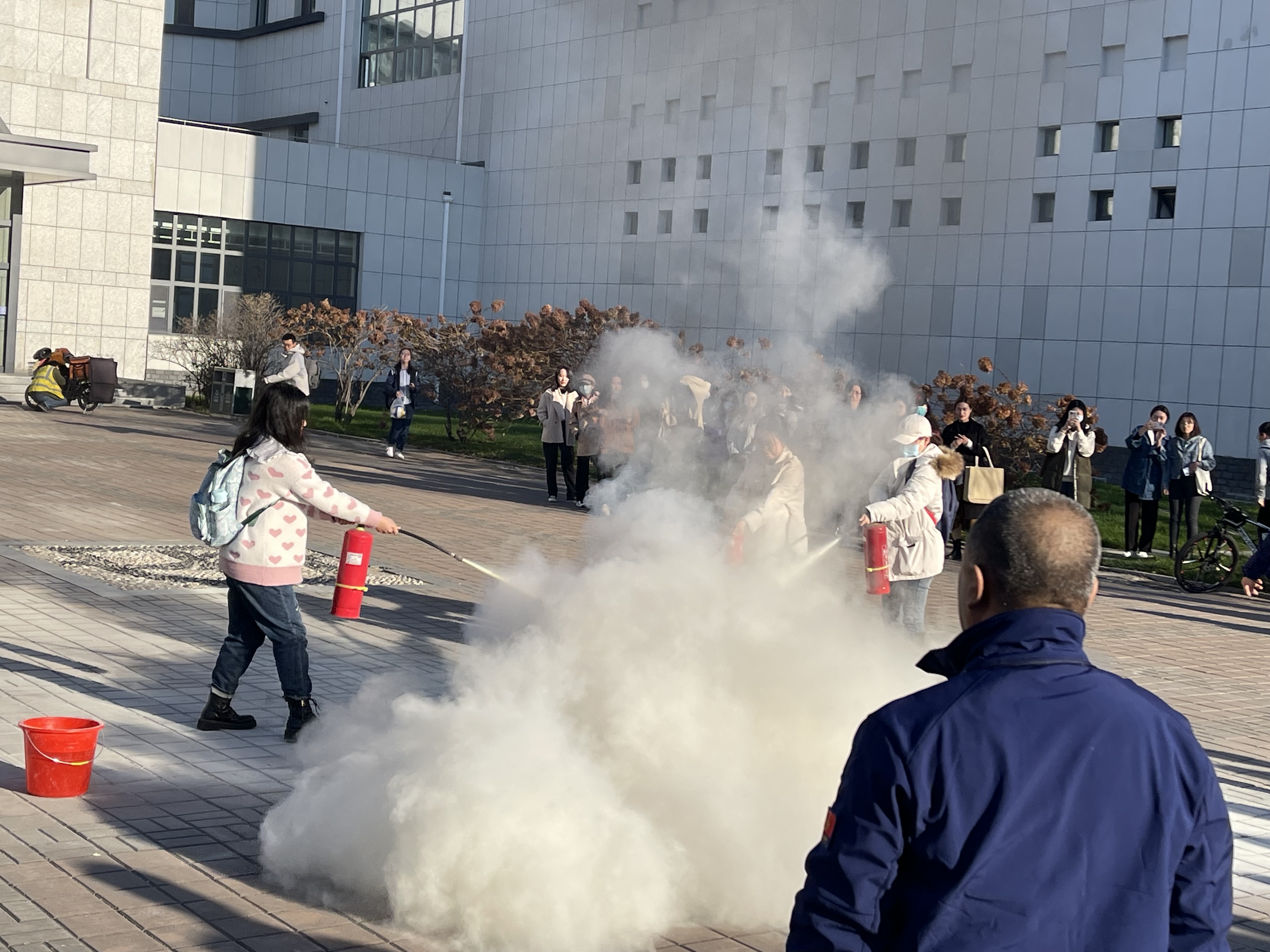 最后,刘明老师根据讲座中教授给同学们的干粉灭火器的正确使用方法做了细致的讲解和演示,为同学们在室外安排了灭火实操训练。同学们积极参与其中,在实践中进一步加深了灭火器使用步骤的深刻印象。