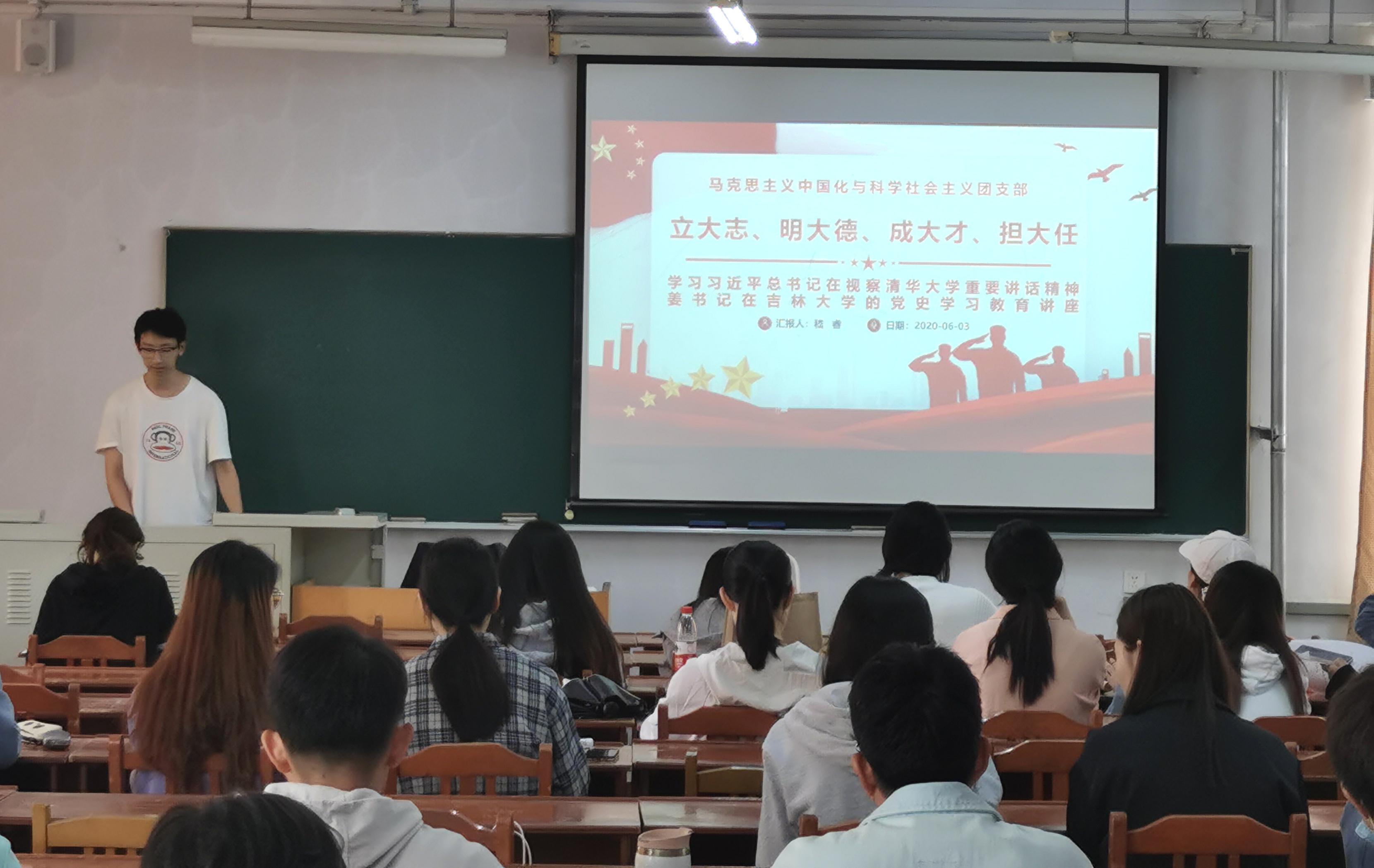 南湖校区3教101室开展以“肩负历史使命 担当复兴大任”为主题的团日活动,本次活动应到党员19人,实到党员18人;应到团员33人,实到团员32人。