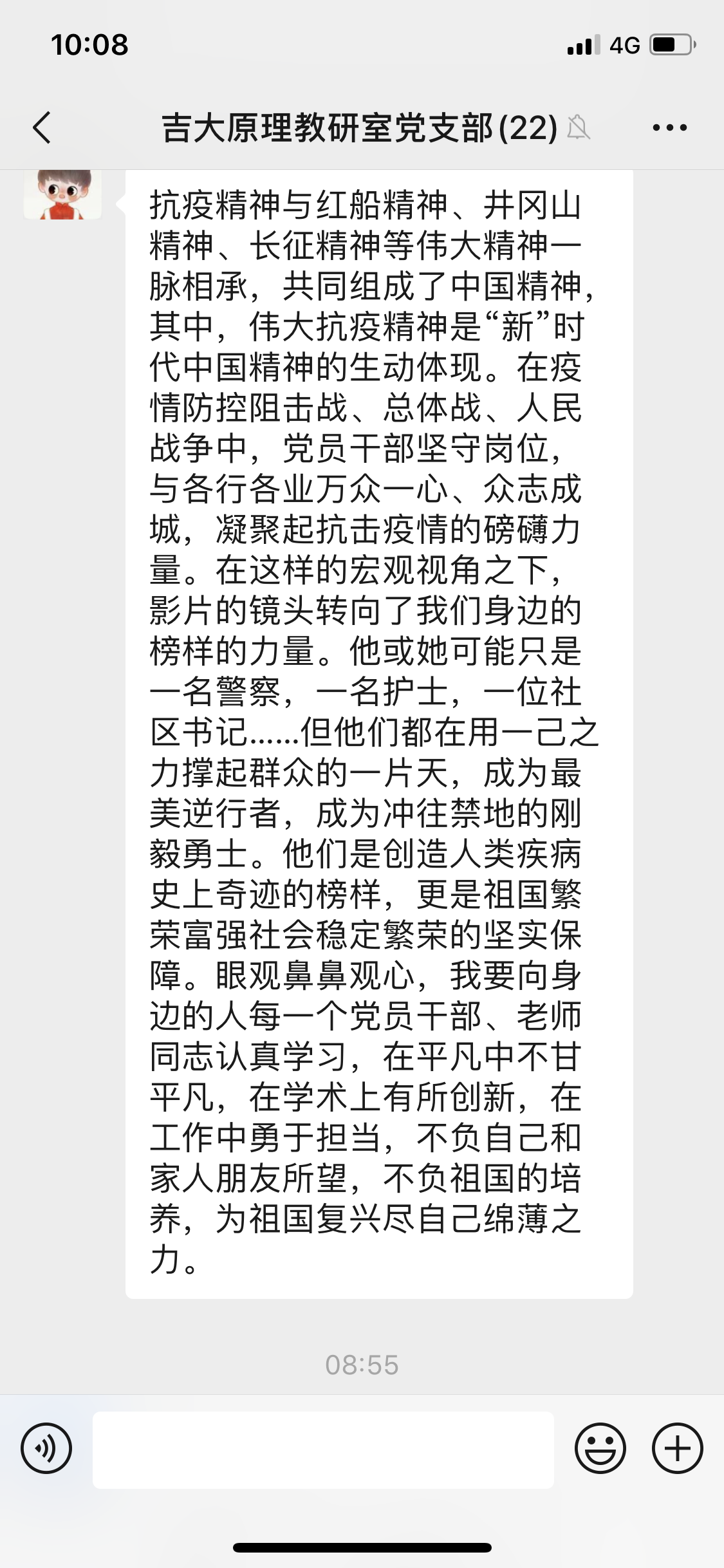 基本原理教工支部积极响应学校党委的号召,把学习榜样的力量与庆祝建党100周年活动紧密结合,于2021年3月29日晚10:00组织收看了《榜样5》专题节目,利用支部微信群举行线上研讨交流会。全体党员在观看节目之后纷纷发表了自己的观后感想。大家一致认为从影片中看到了信仰的力量,深深地感动于这些榜样为了国家和人民的利益勇于担当、无私奉献的精神,而且深刻地感受到信仰对于党员,就像灵魂之于个人。榜样的力量是无穷的,大家也都表示,作为思政课教师,要做好自己本职工作,为新时代中国特色社会主义伟大事业贡献自己的一份力量。
