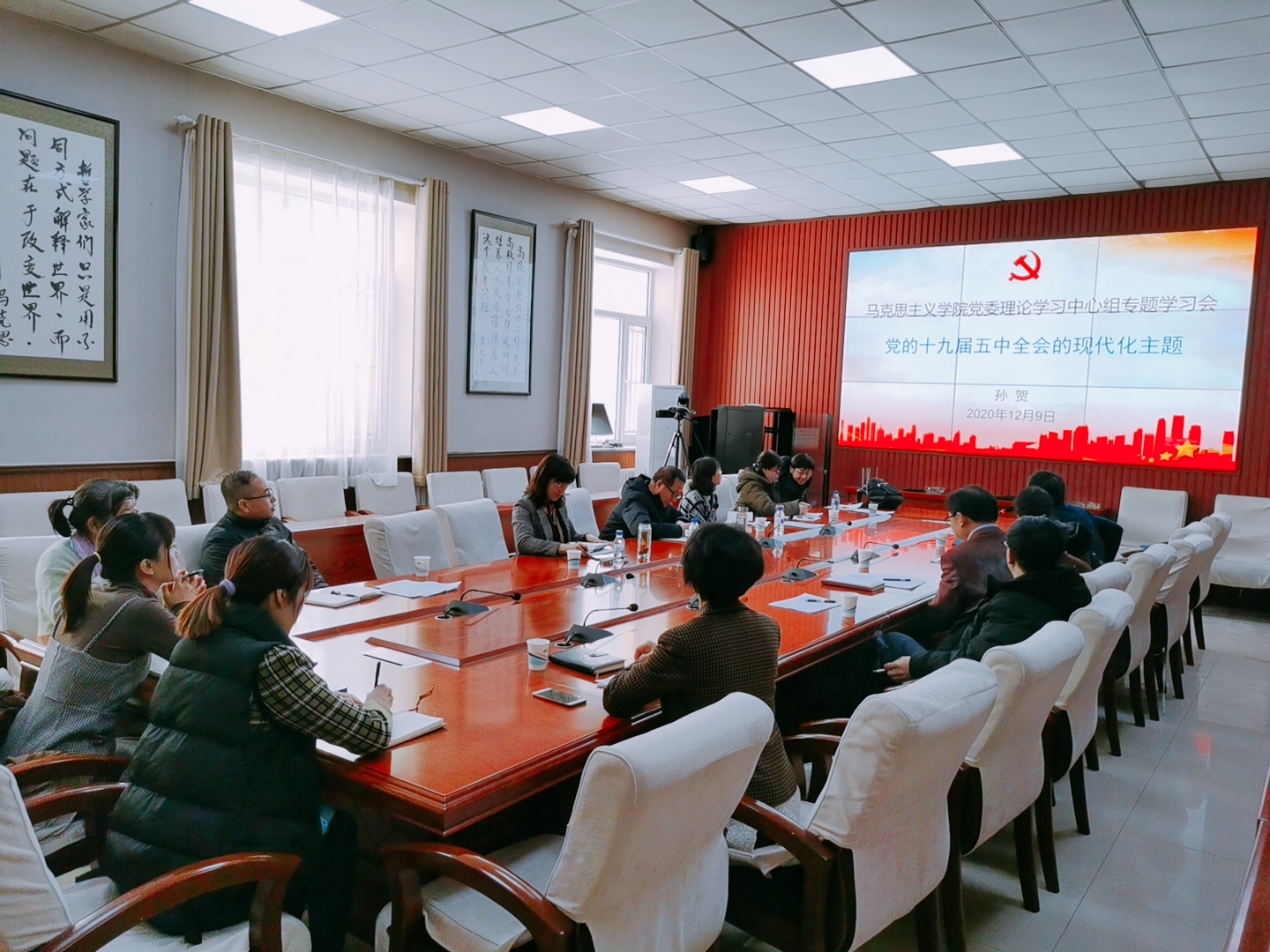 为深入学习贯彻党的十九届五中全会精神,12月9日上午,杏吧视频 党委理论学习中心组在多媒体会议室召开十九届五中全会精神专题学习会。学院党委理论学习中心组全体成员和全体行政人员参加了学习研讨,专题学习会由中国特色社会主义理论体系研究中心副主任孙贺主讲,报告题目:党的十九届五中全会的现代化主题。党委书记霍志刚主持,院长吴宏政做总结。