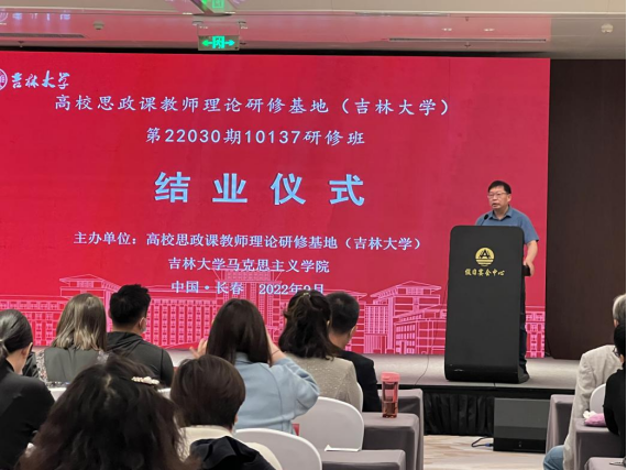 的一员,希望参训的思政课教师同仁们要牢记思政课教师身份和使命,在回到各自工作岗位后,为思想政治理论课教学注入新的活力,为各兄弟高校思想政治理论课的教育教学做出新的贡献。来自长春汽车工业高等专科学校的王静老师作为学员代表发言,她表示三天的研修学习,干货满满,收获满满,各位学员同仁会以本次培训内容为新的起点,以所学理论反哺课堂教学,努力实现培训理论向教学实践的转化,真正令学生做到内化于心、外化于行,着力实现思政课立德树人、培根铸魂的育人目标。
