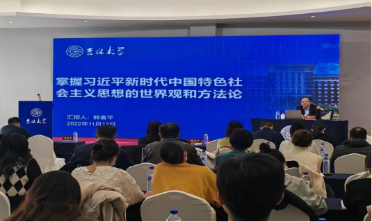 党委副书记韩喜平教授作了题为《掌握习近平新时代中国特色社会主义思想的世界观和方法论》的讲座。韩喜平教授从习近平新时代中国特色社会主义思想创立的时代背景、重要内容、世界观和方法论、历史地位四部分进行了全面、深入的阐释和解读。韩喜平教授对比古今中外,带领大家深入理解当今世界百年未有之大变局和中华民族伟大复兴进入不可逆转的历史进程,明白“十个明确”和“十四个坚持”之间的关系以及“十三个方面成就”等主要内容,帮助我们掌握习近平新时代中国特色社会主义思想的世界观和方法论。