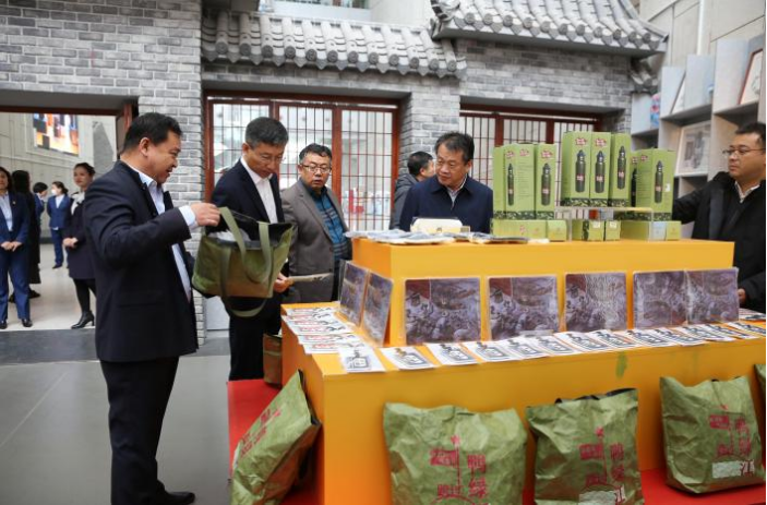 考察组观看红色文创作品展示,了解红色文化元素融入产品开发、市场转化等细节情况。