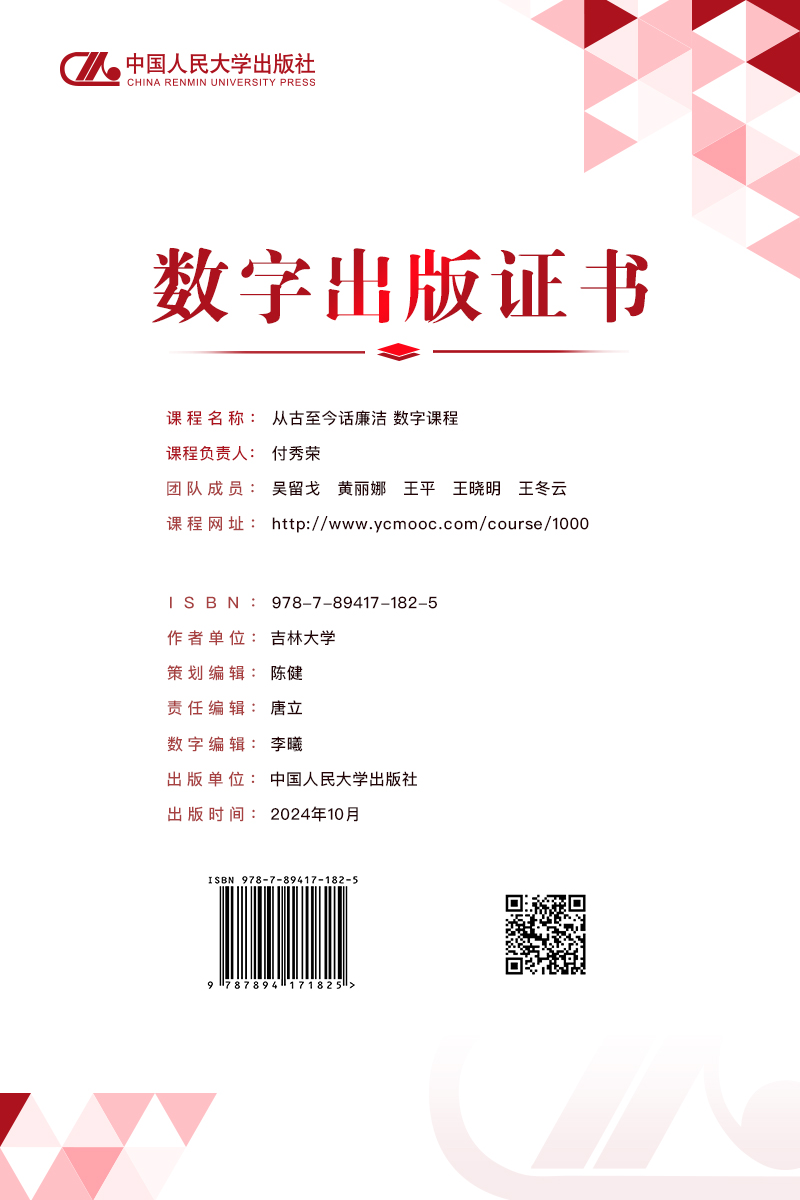 近日,我院一门数字课程——《从古至今话廉洁》,由中国人民大学出版社正式出版上线,实现了我院数字出版形式零的突破。