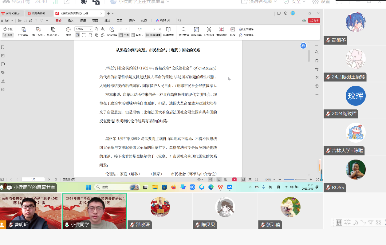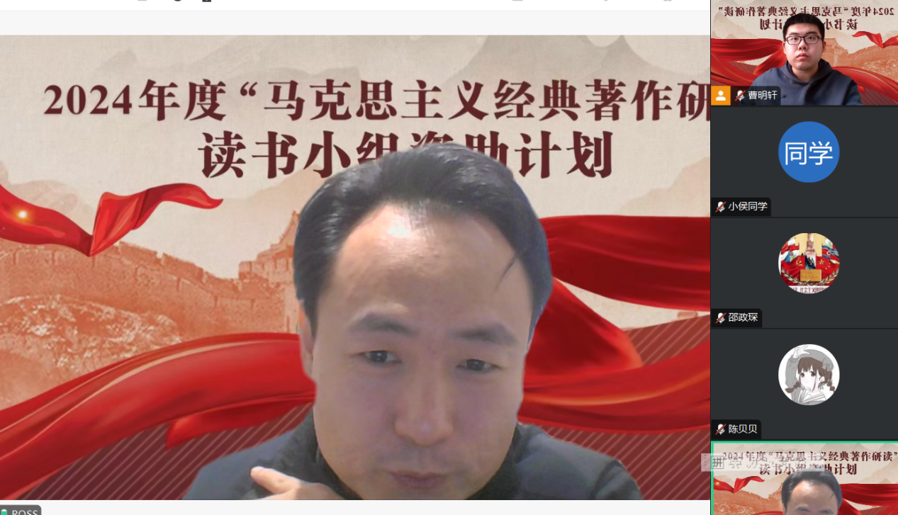 张岩磊老师对侯斌伟同学的文本梳理给予了高度评价,并肯定了两位同学的点评。他提醒同学们在阅读经典时,应以一手文献为基础,避免过度依赖二手研究。此外张老师强调,理解马克思对黑格尔的“颠倒”不能简化为一劳永逸的绝对知识,而应从哲学史的整体脉络中把握其意义,鼓励同学们立足文本本身,逐步拓宽视野,提升对经典著作的理解深度。四、合影留念活动尾声,全体成员云端合影留念。本次研讨历时五十六分钟,通过共读共研,同学们不仅深化了对《德意志意识形态》的理解,更体会到马克思主义“批判与革命”的理论特质。未来,小组将继续以经典著作为依托,在“读原著、学原文、悟原理”中筑牢理论根基,为马克思主义理论研究注入青年力量。